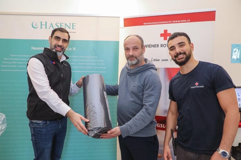 Hasene Avusturya, Wiener Rotes Kreuz ile birlikte evsiz insanlar için uyku tulumu ve mat desteği sağlıyor